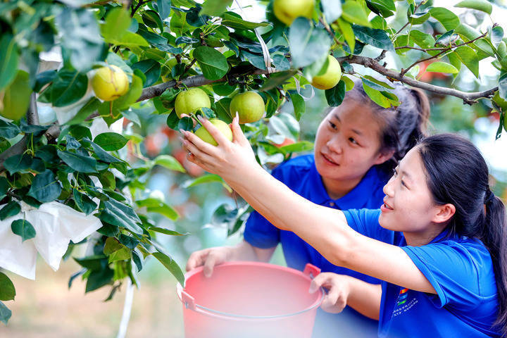 2025年7月2日,在江西省吉安市峡江县金坪民族乡,游客在采摘翠冠梨。陈福平 摄峡江县2024年和2025年先后成功承办吉安市全市“井冈山”农产品区域公用品牌出口首发仪式、全市“井冈山”品牌农产品出口授牌仪式等多场重大活动,并与壹路集团建立“井冈山”水果海外直采基地并授牌,推动翠冠梨、猕猴桃、蒜酥等11个“井冈山”品牌农产品走出国门,远销东南亚国家,出口额达3000万元。